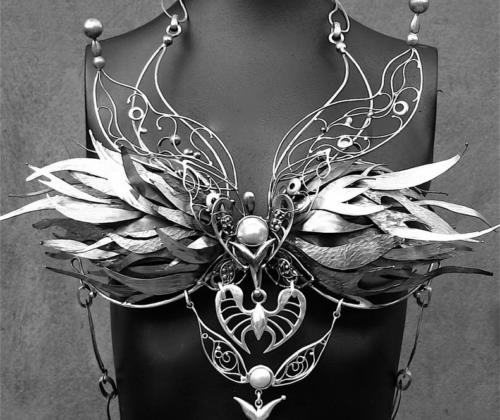 “Victoria Edgar has created a new series of metal sculptural lighting as well as some recent and past wearable-art pieces, nymph sculptures, sterling silver/gold and pearl jewellery with a range of more rustic pieces.”